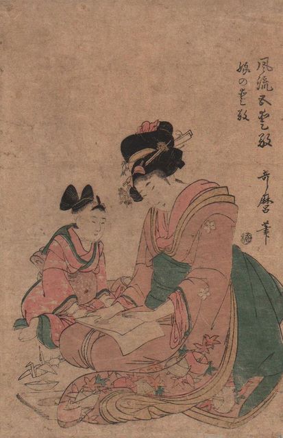 El grabado Fūryū kodakara (Elegantes Tesoros Infantiles) de Utamaro II es una obra que, a primera vista, nos ofrece una ventana a la intimidad de un hogar del Período Edo, capturando un delicado momento de instrucción entre una madre y su hija. La escena, de una apacible belleza, parece una simple representación costumbrista. Sin embargo, un análisis más profundo revela que esta pieza es un punto de confluencia entre la herencia artística de un gran maestro del ukiyo-e y la documentación de una arraigada práctica cultural.