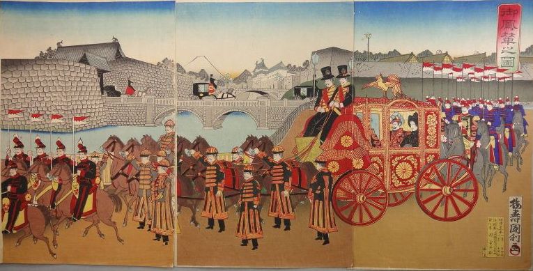 Durante la era Meiji, el fuerte impacto de la llegada de la tecnología y de personas y costumbres occidentales, dio origen al género conocido como «estampas de la civilización» kaika-e. Kunitoshi brilló de manera especial en ese campo, convirtiendo sus numerosas obras en un detallado catálogo visual de la modernidad japonesa. Sus grabados documentan con precisión la nueva velocidad de los ferrocarriles, la arquitectura de las estaciones de tren, el bullicio internacional del puerto de Yokohama repleto de barcos de vapor, y los imponentes edificios de ladrillo de estilo occidental, como bancos y hoteles, que alteraban por completo el paisaje urbano tradicional. Más que simples imágenes decorativas, estas piezas funcionaban como un riguroso reportaje gráfico que enseñaba a la población local cómo era el cambio de su país. En este proceso, la perspectiva del paisaje en el ukiyo-e evolucionó desde un clásico «formato de diseño», caracterizado por vistas aplanadas y prioridades estéticas, hacia un «formato pictórico» inspirado fuertemente en la perspectiva occidental, que buscaba un registro fiel, realista y de un solo punto de vista del mundo que les rodeaba.
