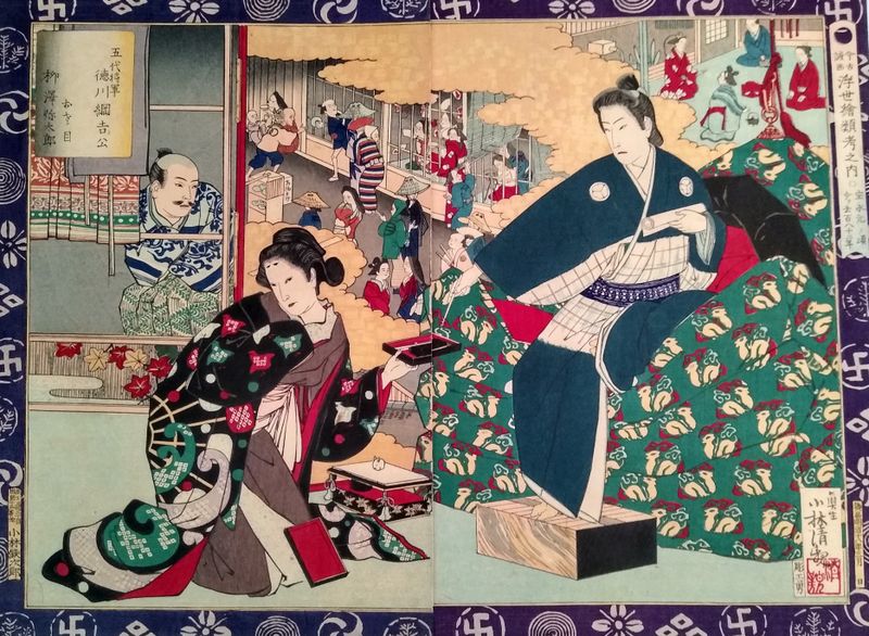 Este grabado japonés (ukiyo-e) es de 1885, creado por Kobayashi Kiyochika durante la era Meiji, sirve como crítica política e histórica. La obra centraliza al quinto Shogun Tokugawa Tsunayoshi, infamemente conocido como el «Shogun Perro» debido a sus extravagantes «Edictos de Compasión» que protegían excesivamente a estos animales. En el ukiyo-e se identifica a las tres figuras clave en la composición: el Shogun sobre una plataforma con cachorros estampados en su ropa, una dama de la corte arrodillada, y el manipulador Gran Chambelán Yanagisawa Yoshiyasu observando desde una ventana. Además, se destaca el uso del fondo para satirizar la vida callejera de Edo, mostrando el contraste entre la élite desconectada y el sufrimiento popular.